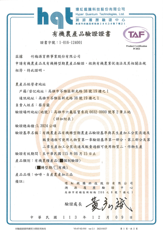 竹梅源咖啡莊園所栽種的咖啡豆,榮獲國家級「有機農產品認證證書」,全程採用無農藥、無化肥的自然農法栽培,嚴守環境友善與永續精神。我們相信,純淨的土地與細緻的手工呵護,才能孕育出口感純粹、香氣豐富的高品質咖啡豆,帶給每一位品飲者安心與感動。